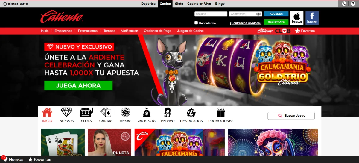 Caliente casino online Mexico lleva mas de 30 anos en el mercado del entretenimiento. La plataforma esta disponible desde cualquier dispositivo, sin descargas, con registro en menos de 3 minutos. Slots, casino en vivo, apuestas deportivas y ruleta en un solo lugar. El bono de bienvenida de hasta $20,000 MXN se activa con el primer deposito. Los pagos se procesan via OXXO, SPEI y PayPal. Caliente casino online Mexico opera con licencia oficial de SEGOB.